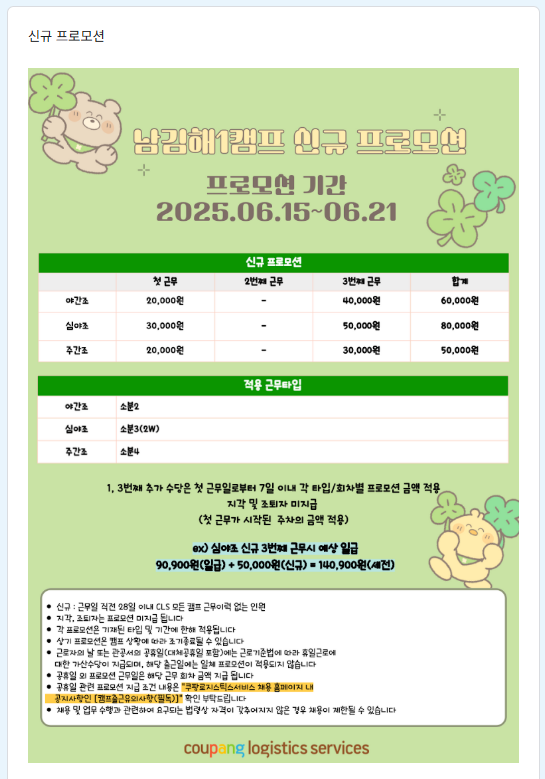 처음의 계획(하루5시간..최저생활비만 벌자..)을 망각한 채 심야조를 해야하나 고민...다른 블로그의 알바후기를 뒤져본다... 역시나...5시간 알바도 ㄱ빡쎄다는 후기가 대부분.. 특히나 본격 여름으로 접어드는 6월 중순.. 욕심을 버리고 수당 금액이 가장 적지만 애초 계획대로 주간조 소분팀으로 지원했다.