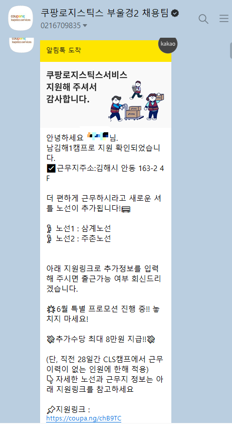알바천국의 지원하기 버튼을 누르면 홈페이지 지원으로 자동연결되어 설문서 작성(거주지, 희망근무일, 시간)하면 나의 거주지에 맞춰서 가능한 곳으로 지정되어 카톡으로 연락이 온다.